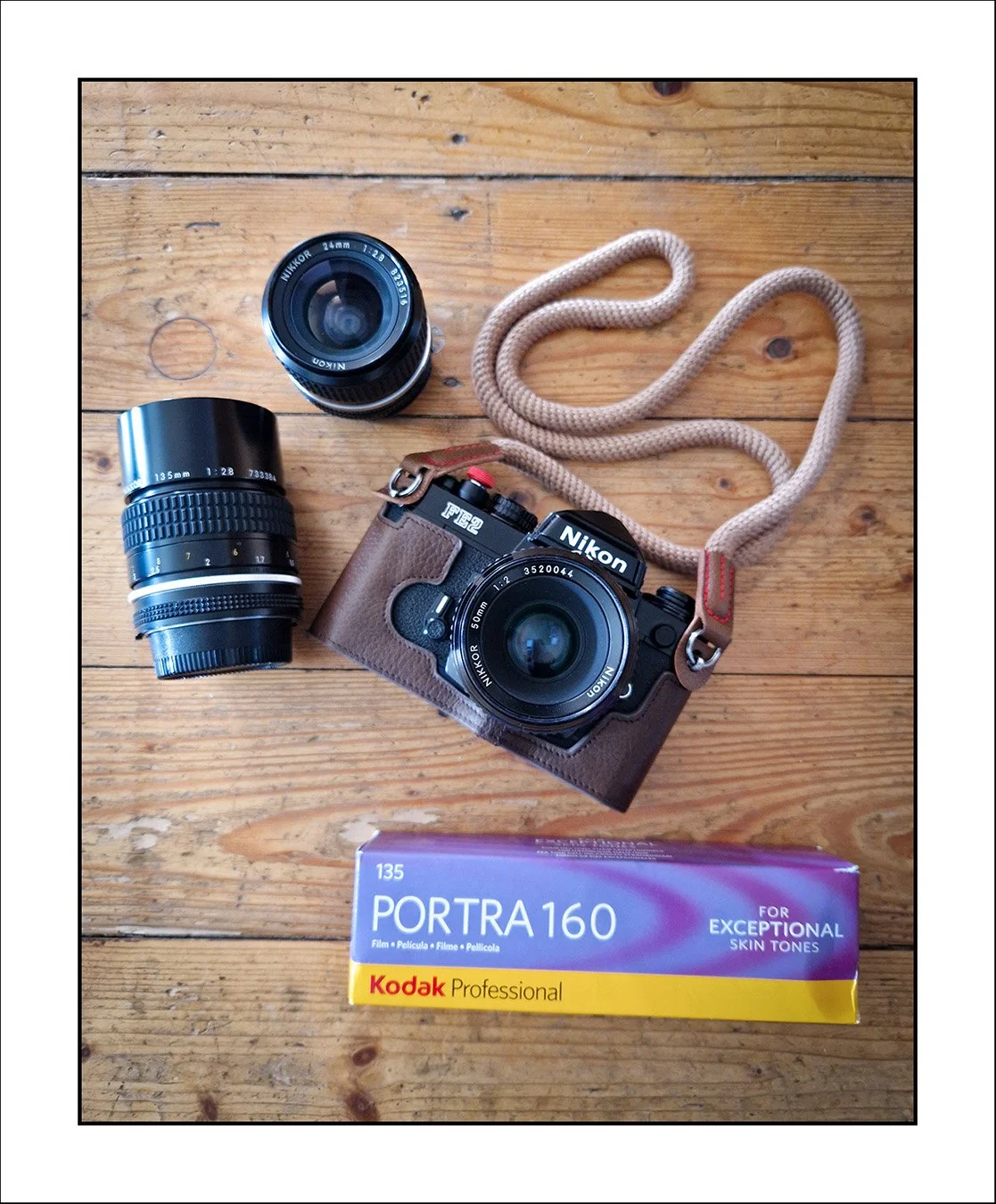 Ausrüstung für den Sommerurlaub. Nikon FE2 mit AI/AIS Objektiven. AIS Nikkor 24mm,f2,8 AI Nikkor 50mm f2 AI Nikkor 135mm f2,8. Meiner FE2 habe ich eine Schutzhülle aus Leder spendiert. Die Kamera wird geladen mit dem Kodak Portra 160. Die Kamera, die Linsen und die Filme verstehen sich sehr gut. ;o)
